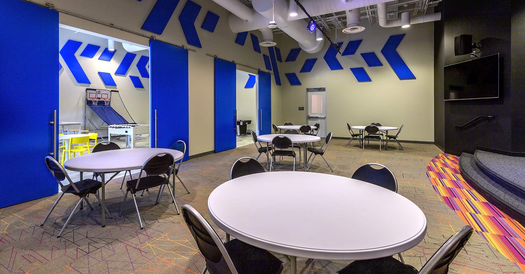 The building contains a separate worship space for both student groups, each of which have a unique aesthetic and arrangement. Surrounding the worship spaces are large lobby areas where students can engage one another in developing relationships or in recreation. The spaces also serve as the pre-function lobby area for the worship venues. Flexible spaces provides areas for casual mingling and link the building entrance to the worship spaces. Pocket spaces, or rooms within a room, were incorporated to provide a variety of seating options for students. The overall concept was to create a welcoming, inviting building that encourages students to congregate and worship comfortably.